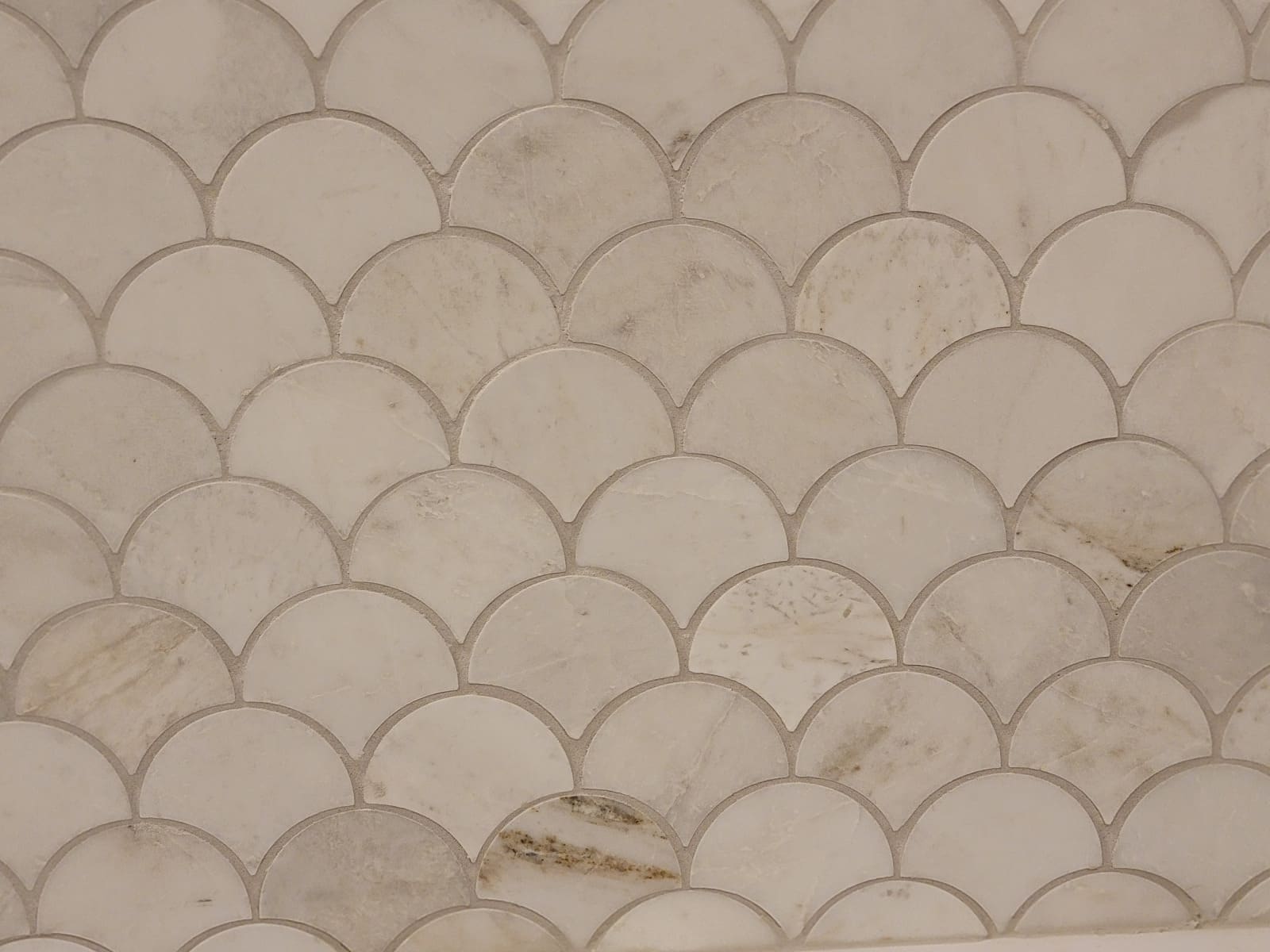 Behind the vanity, decorative fish-scale mosaic tile was selected as a backsplash element. This tile pattern introduces texture and movement to the wall surface while maintaining a soft and elegant color palette. Mosaic tile patterns are often used in smaller areas to create visual interest without overwhelming the design.