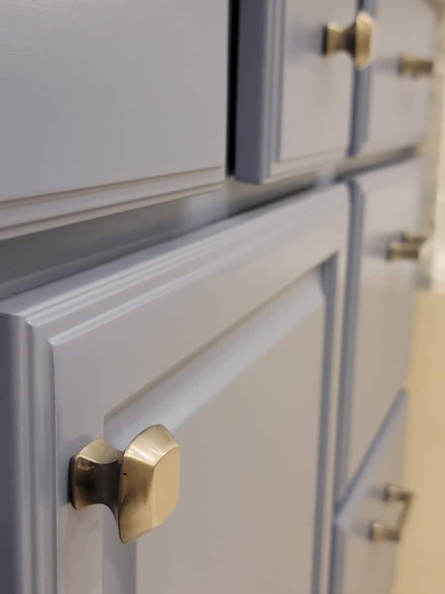 The cabinetry introduces a subtle blue tone that brings calmness and depth to the room. This color choice adds character without overpowering the overall palette. Brushed gold hardware was selected to complement the cabinetry, providing a warm metallic contrast that elevates the design while maintaining a balanced aesthetic.